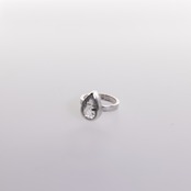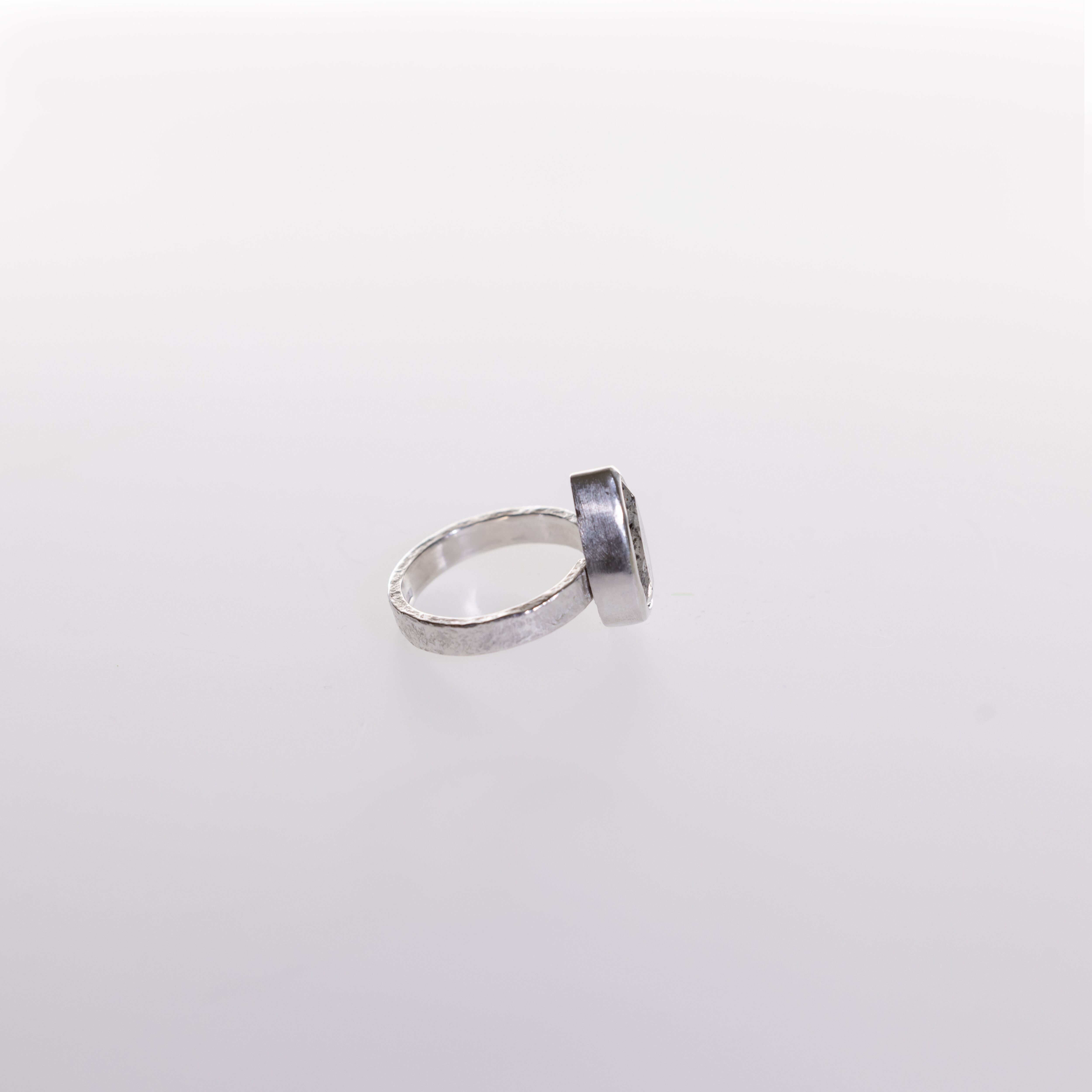 存在感ある石の大きさに合わせて地金にボリュームを持たせたアーム部分は内側を鏡面、外側を槌目仕上げにすることによりフィット感とデザイン性を追求しています。