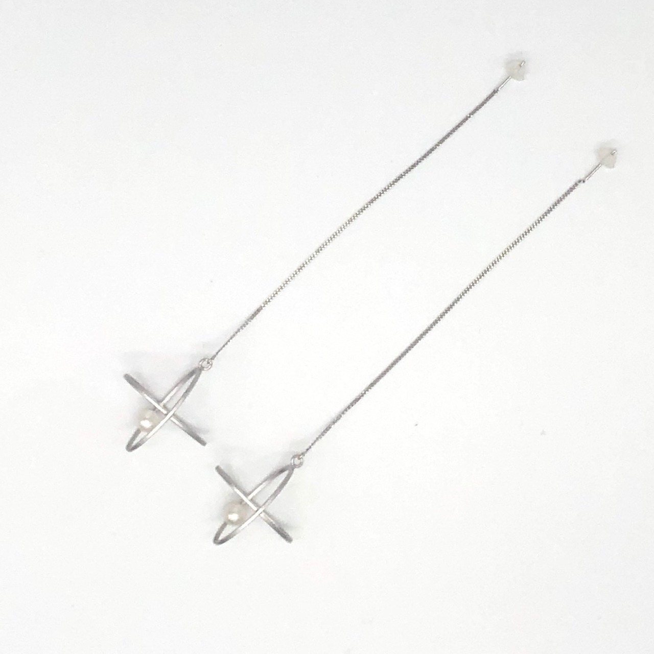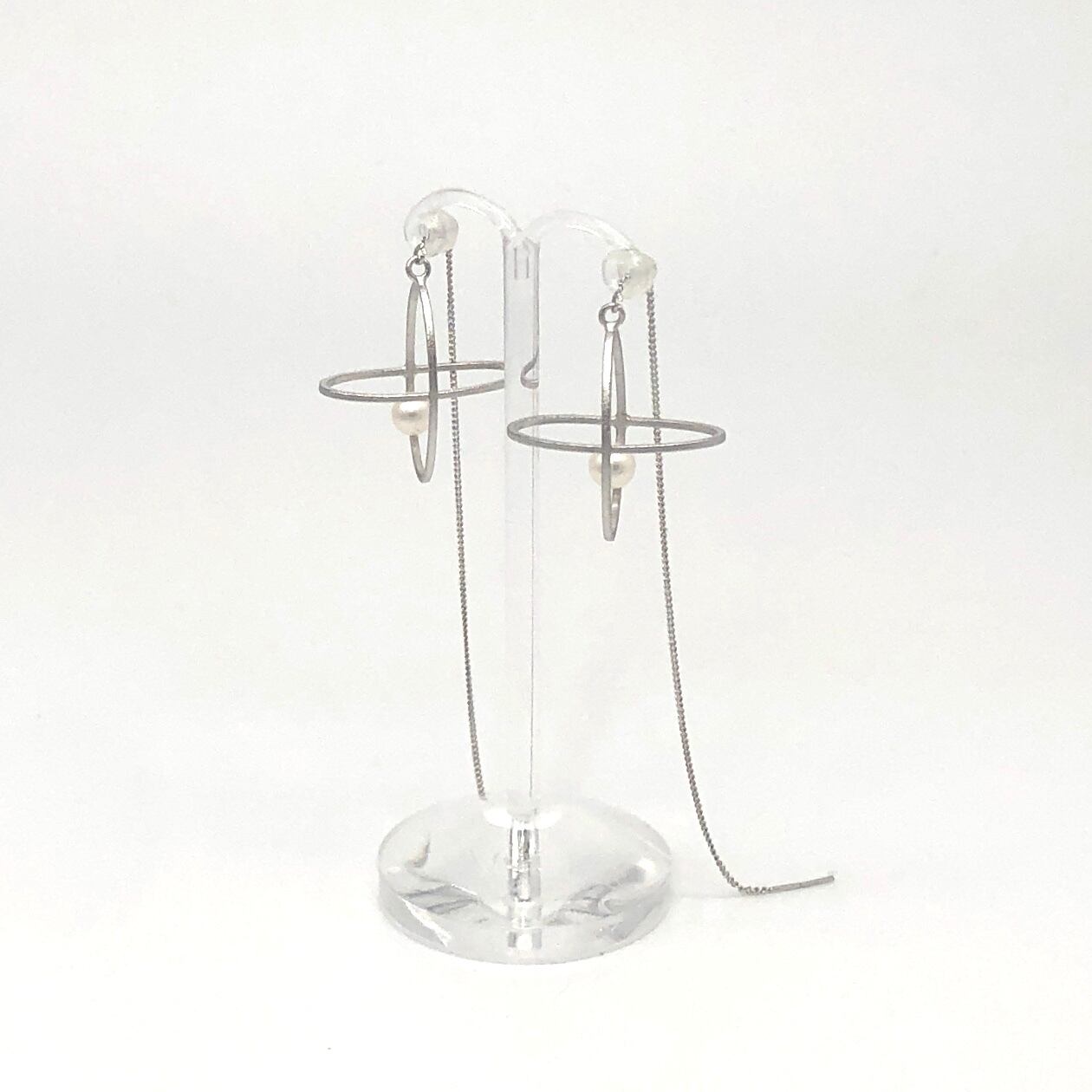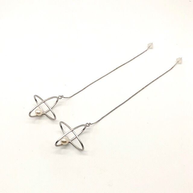 天体「PLANET」をイメージしたモチーフ、揺れ感があるアメリカンタイプのピアスです。耳の後ろから垂れる繊細なチェーンがエレガントに印象づけます。